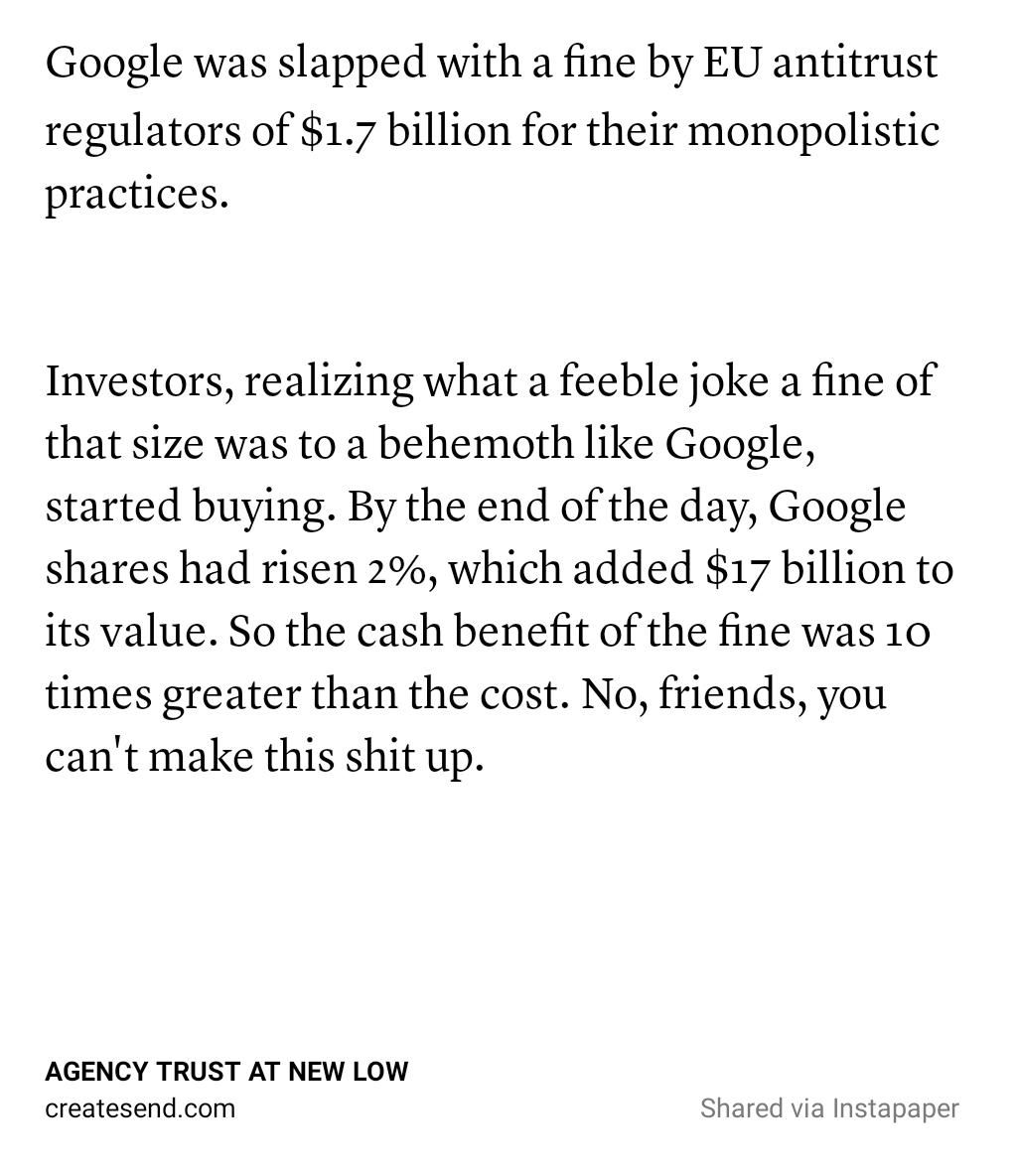 Google's EU fine was so low it caused investors, excited by a lack of consequences, to pump up the value of the company by 10x the fine.