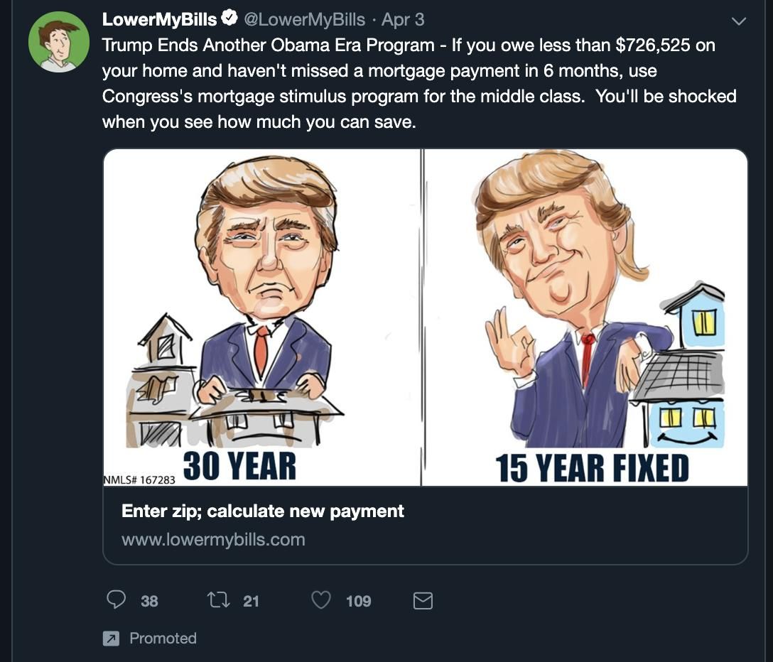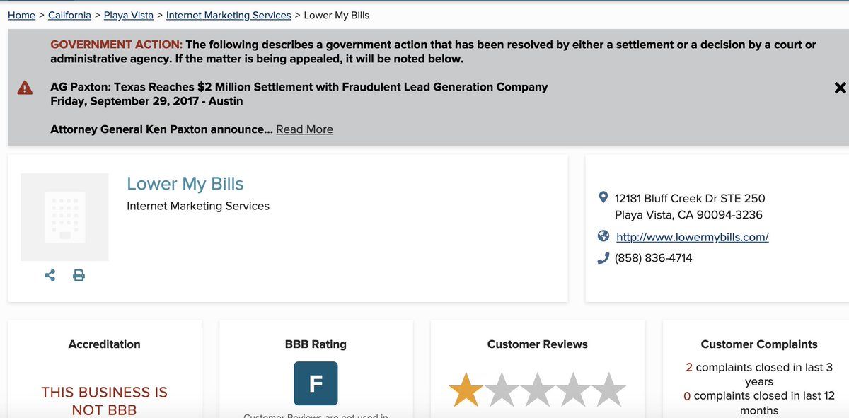 I think my favorite part of this Twitter ad is that if you click through the link and click on the BBB button *they* put on there themselves, the BBB page calls them a "Fraudulent Lead Generation Company" bbb.org/us/ca/playa-vista/profile/internet-marketing-services/lower-my-bills-1216-13130473