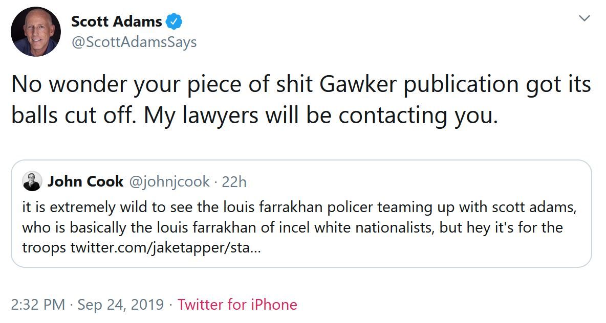 : Scott Adams, of "Dilbert" fame, threatens legal action over tweet mocking him