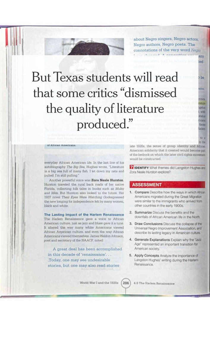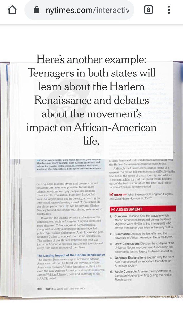 Like... WTF, imagine the cruelty and pettiness it takes to alter a textbook to pretend that the Harlem Renaissance was irrelevant. This cannot possibly be ignorance, it's just racism, pure and simple.