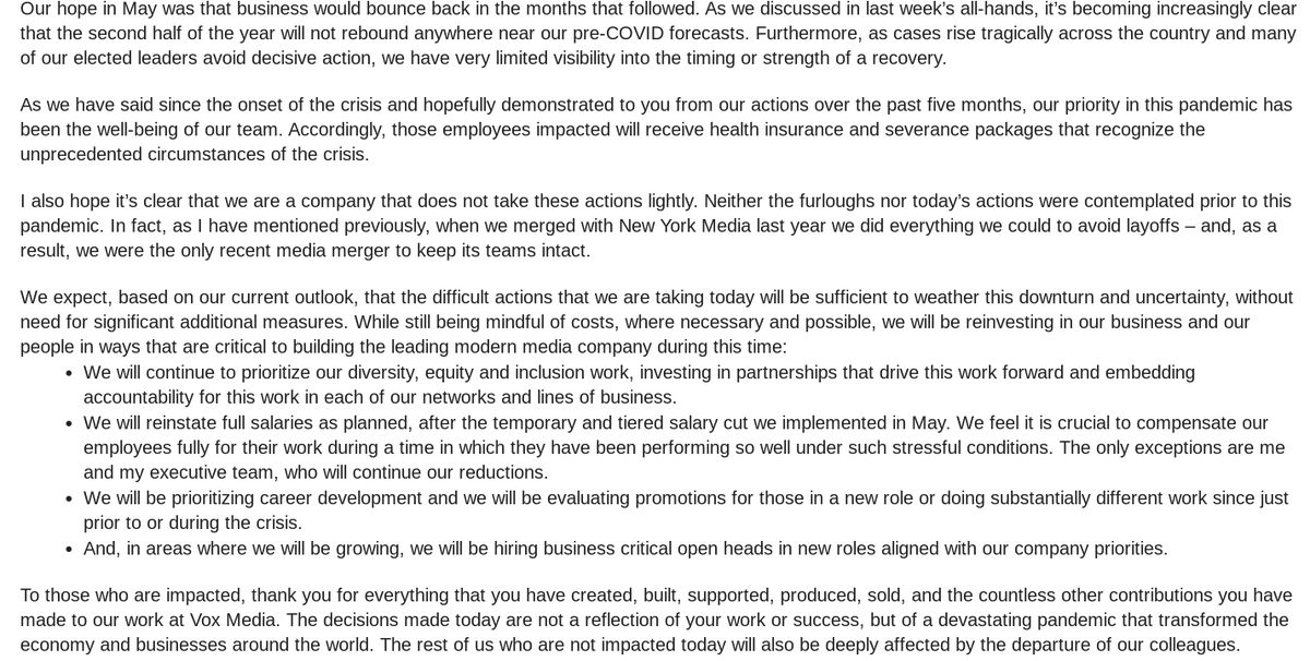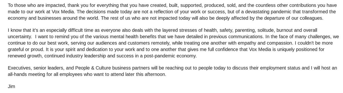 : Vox Media laying of 6% of staff, according to memo from CEO Jim Bankoff: