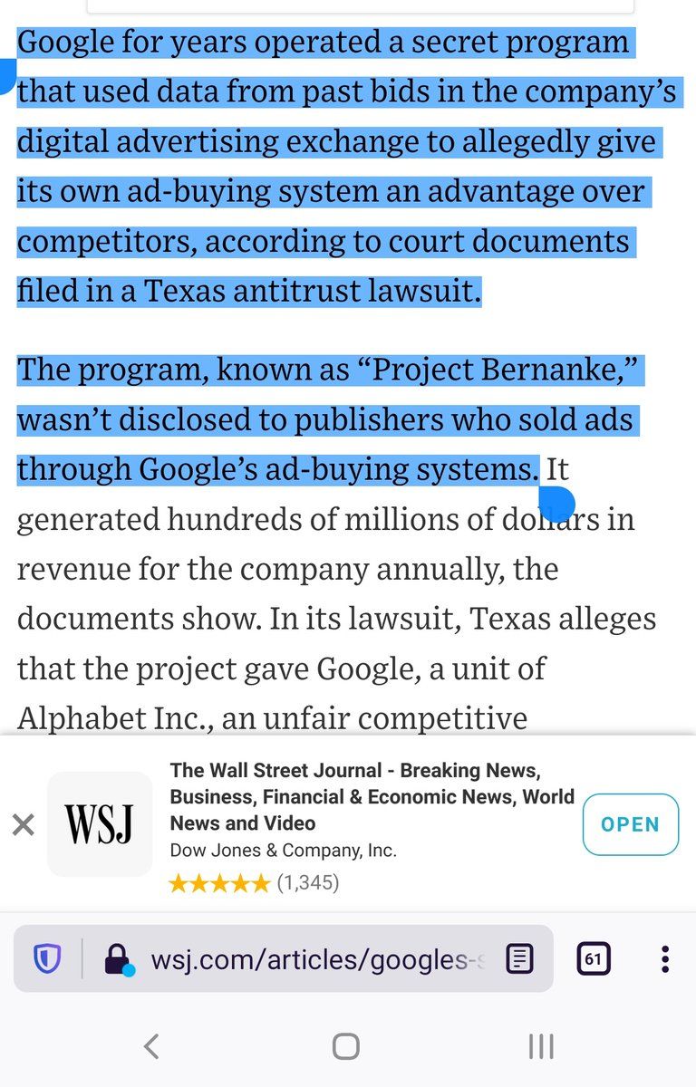 I might be starting to come around to some folks' position that no ad tech conspiracy theory about Google is too wild or anti-competitive to be true. wsj.com/articles/googles-secret-project-bernanke-revealed-in-texas-antitrust-case-11618097760?redirect=amp#click=https://t.co/0TOHffVj9K