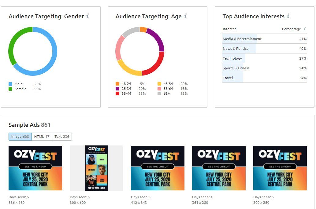 So, one last thing to check... SEM Rush, what's it's footprint for last month? semrush.com/analytics/overview/?q=https%3A%2F%2Fwww.ozy.com%2F&searchType=domain 242.3k in Organic Search Traffic, almost entirely US, mostly imgs 1.4m backlinks... via 29.27k domains 861 ads, across 545 sites... Many are for the 2020 festival though.