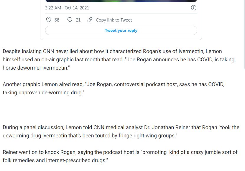 mathewi And it is worth noting that *even FOX* when covering this understands that there is a specific line and CNN walked right up to it but didn't cross it: the difference between 'Rog*n is taking horse dewormer' & 'taking a drug that is used as horse dewormer'