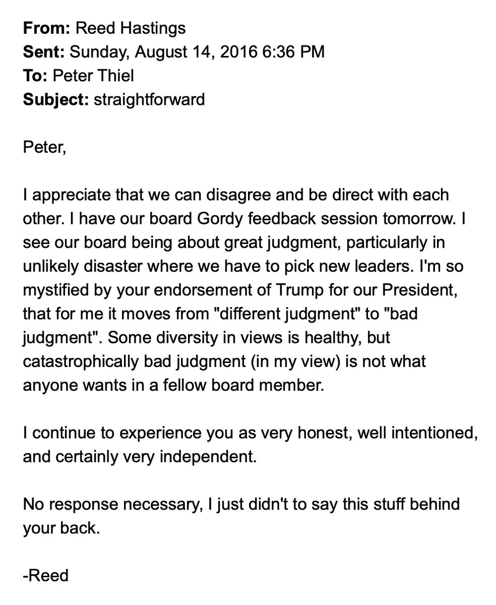 : Reed Hastings emails Peter Thiel August 14, 2016
