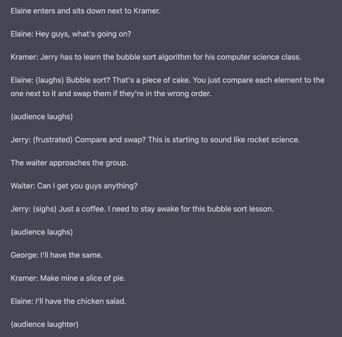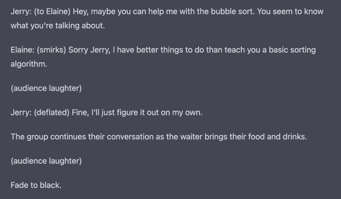 : OpenAI's new ChatGPT writes a Seinfeld scene in which Jerry needs to learn the bubble sort algorithm: