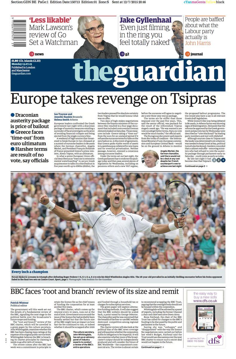 : Guardian front page, Monday 13 July 2015: Europe takes revenge on Tsipras