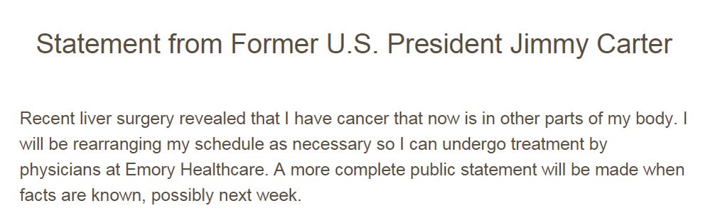 : JUST IN: Former U.S. President Jimmy Carter reveals he has cancer, will undergo treatment.